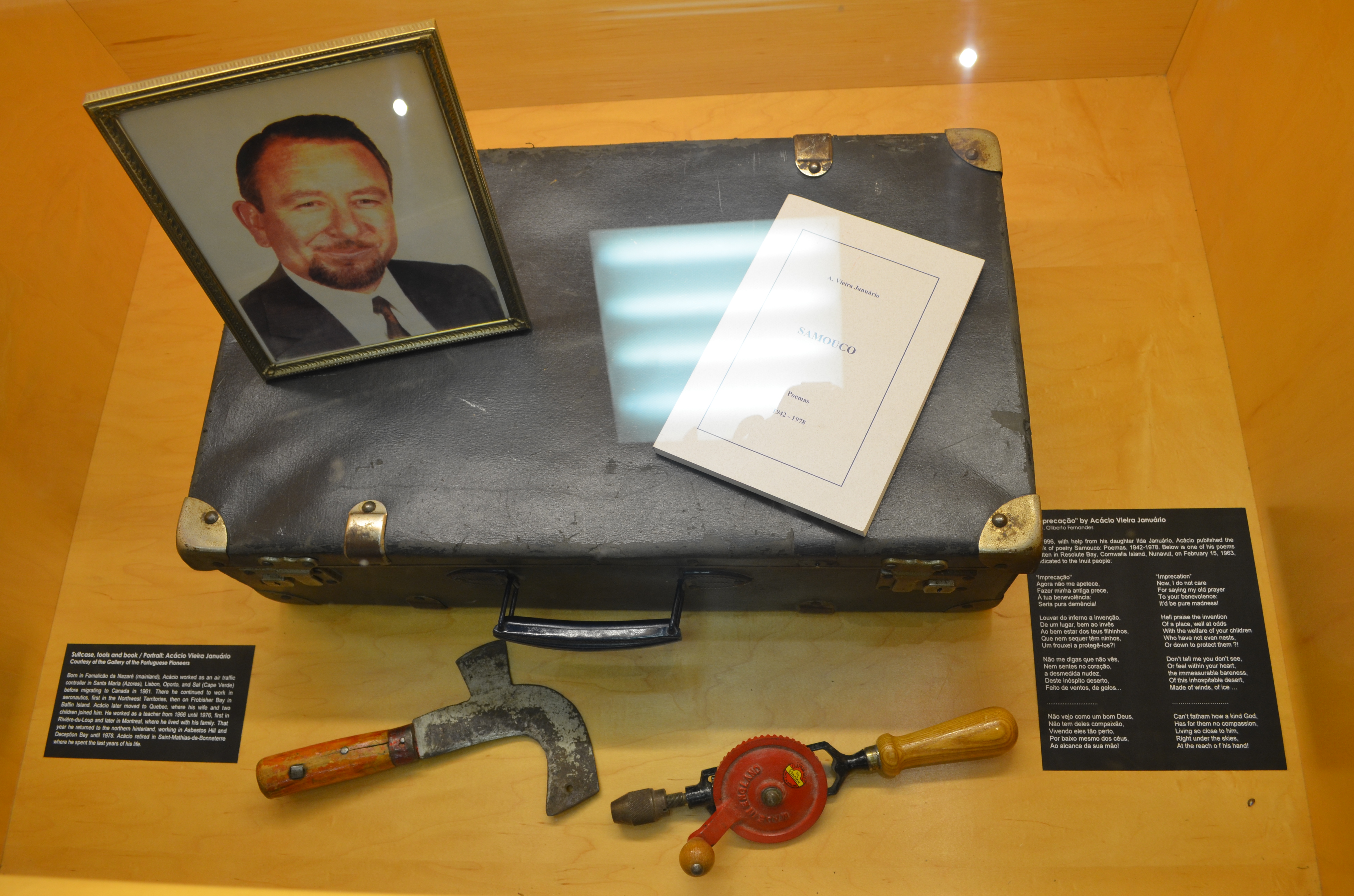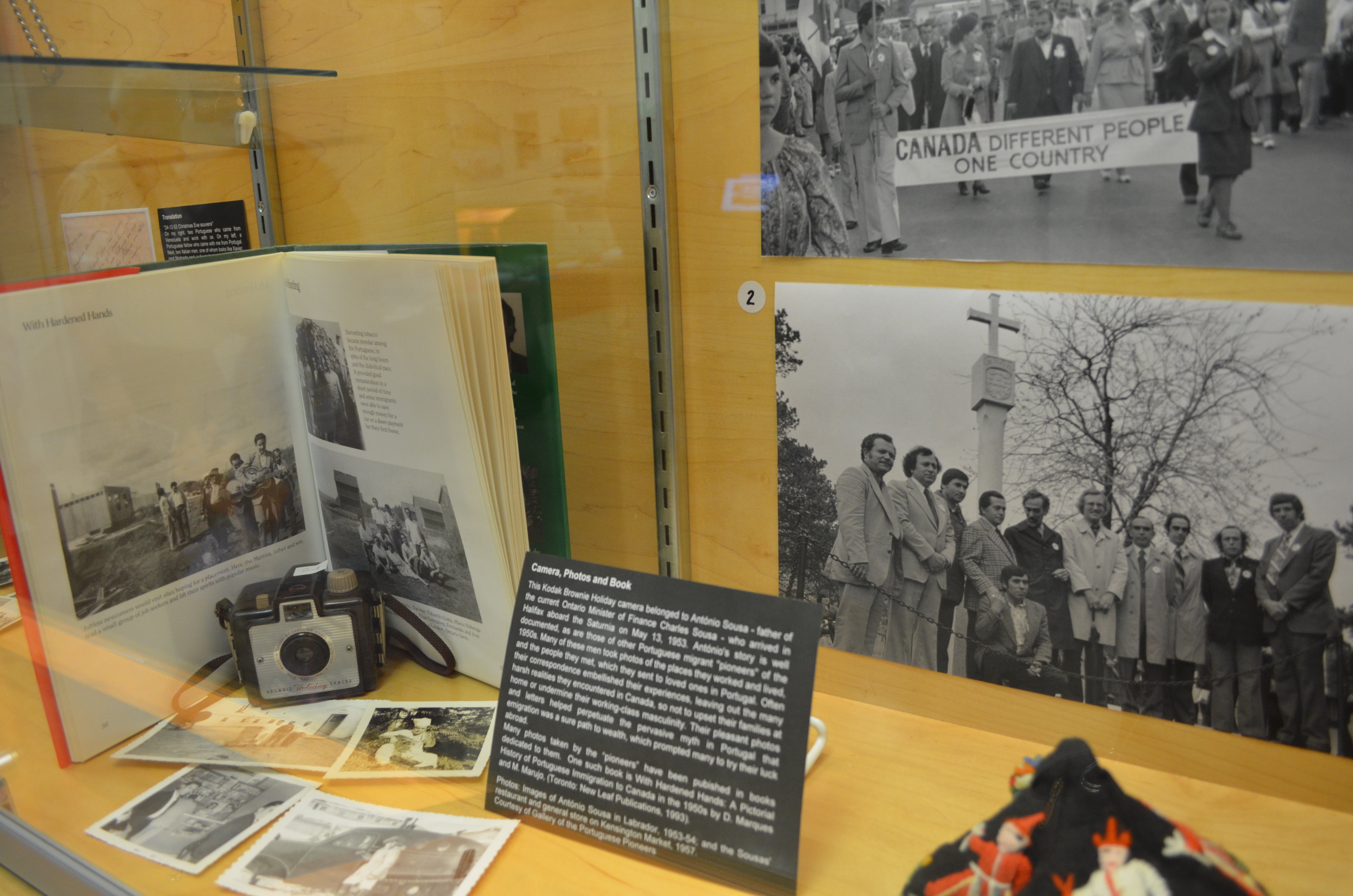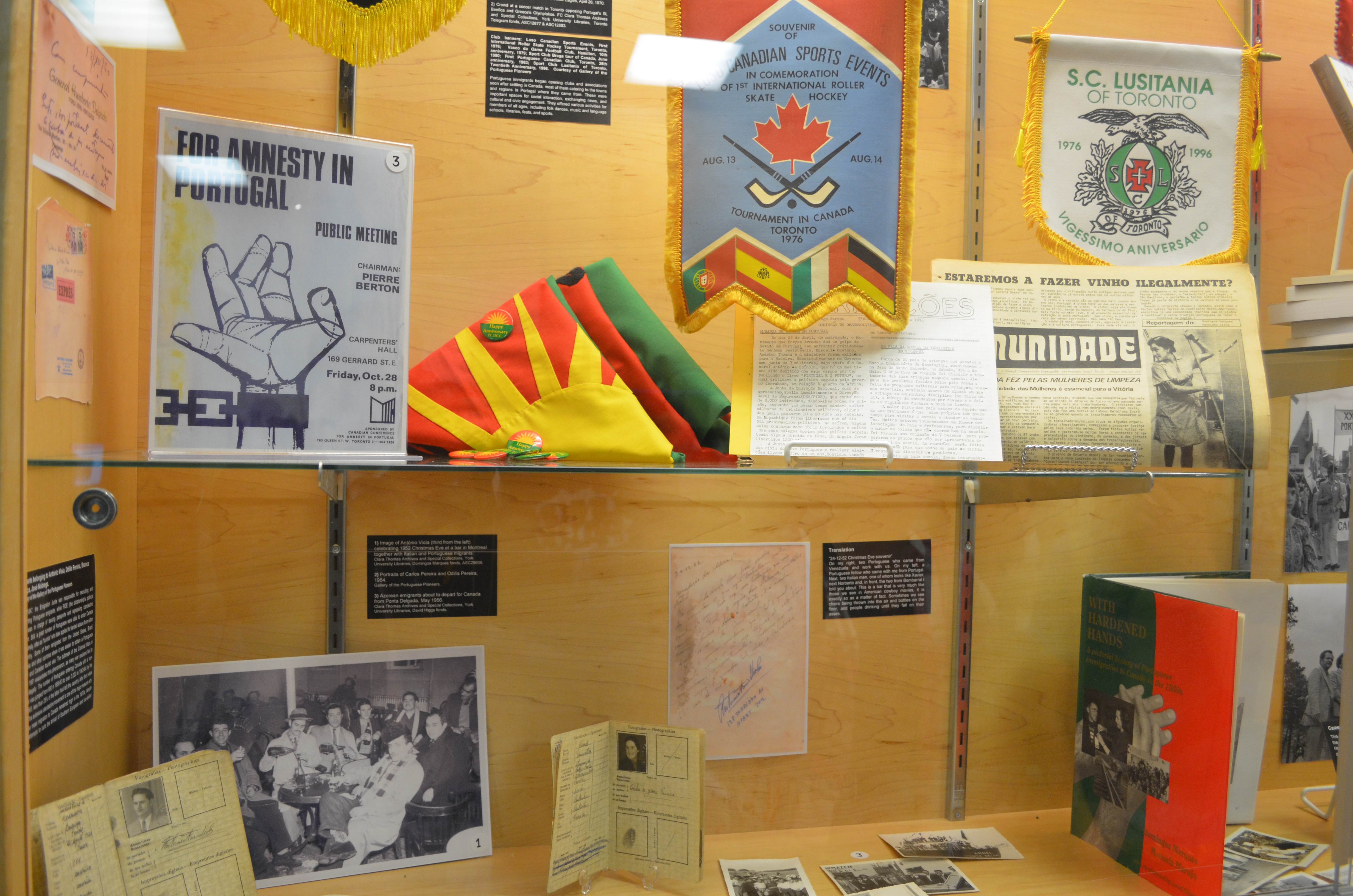Our gratitude extends to Manuel da Costa and Andrea Carvalho of the Gallery of the Portuguese Pioneers for lending us several artifacts from their collection, and to Anthony de Sa and Nuno Cristo for having accepted our invitation and coming all the way from Toronto to Strathroy on a week day. As always, we are indebted to the Clara Thomas Archives and Special Collections, especially our colleague Anna St. Onge, who was instrumental in getting many of the materials ready in time for the exhibit’s unveiling. The PCHP’s connection with the Strathroy-native Clara Thomas also presented us with the opportunity to celebrate the memory of that pioneer scholar, teacher, and overall promoter of Canadian literature, through the words of her friend John Lennox. Thank you also to the Portuguese Canadian Club of Strathroy for supporting some of the costs of the opening reception on July 9 and for helping spread the word about the exhibit.
