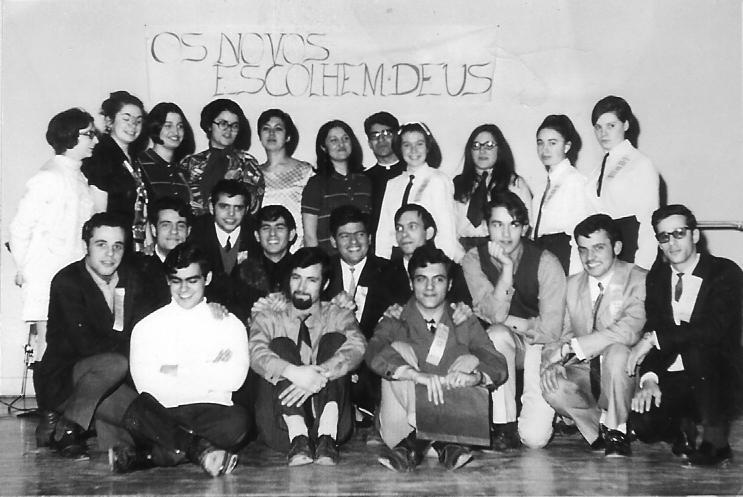 Black and white photo of a group of young Portuguese men and women in front of a banner that says “Os novos escolhem Deus” (The young choose Christ). Sitting in the front row, with a beard, is Domingos Marques. In the second row, third from the right, kneeling, is Martin Silva. In the back row, at the center, is Fr. Cândido.