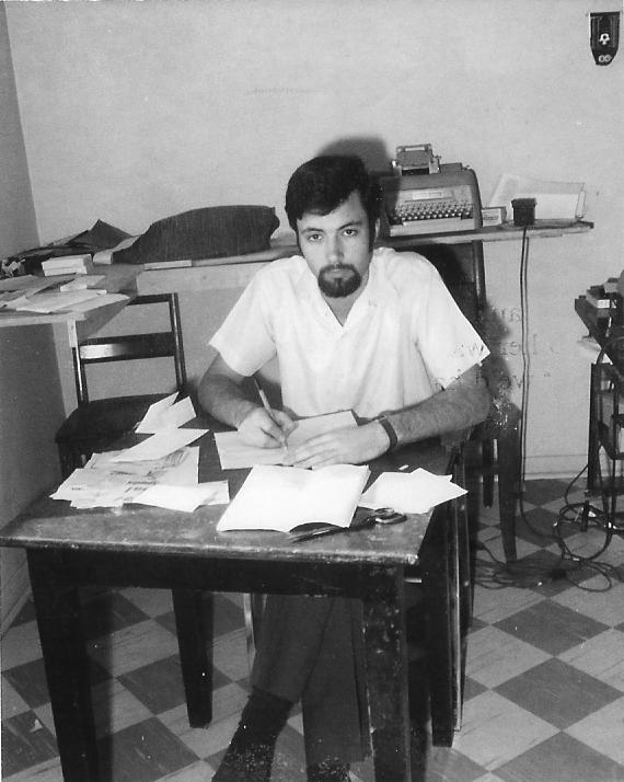Black and white photo of Domingos Marques working at a small desk in the office of the Portuguese community newspaper O Jornal Português, owned by Fr. Alberto Cunha, located on Dundas St. West and Palmerston Avenue in Toronto.