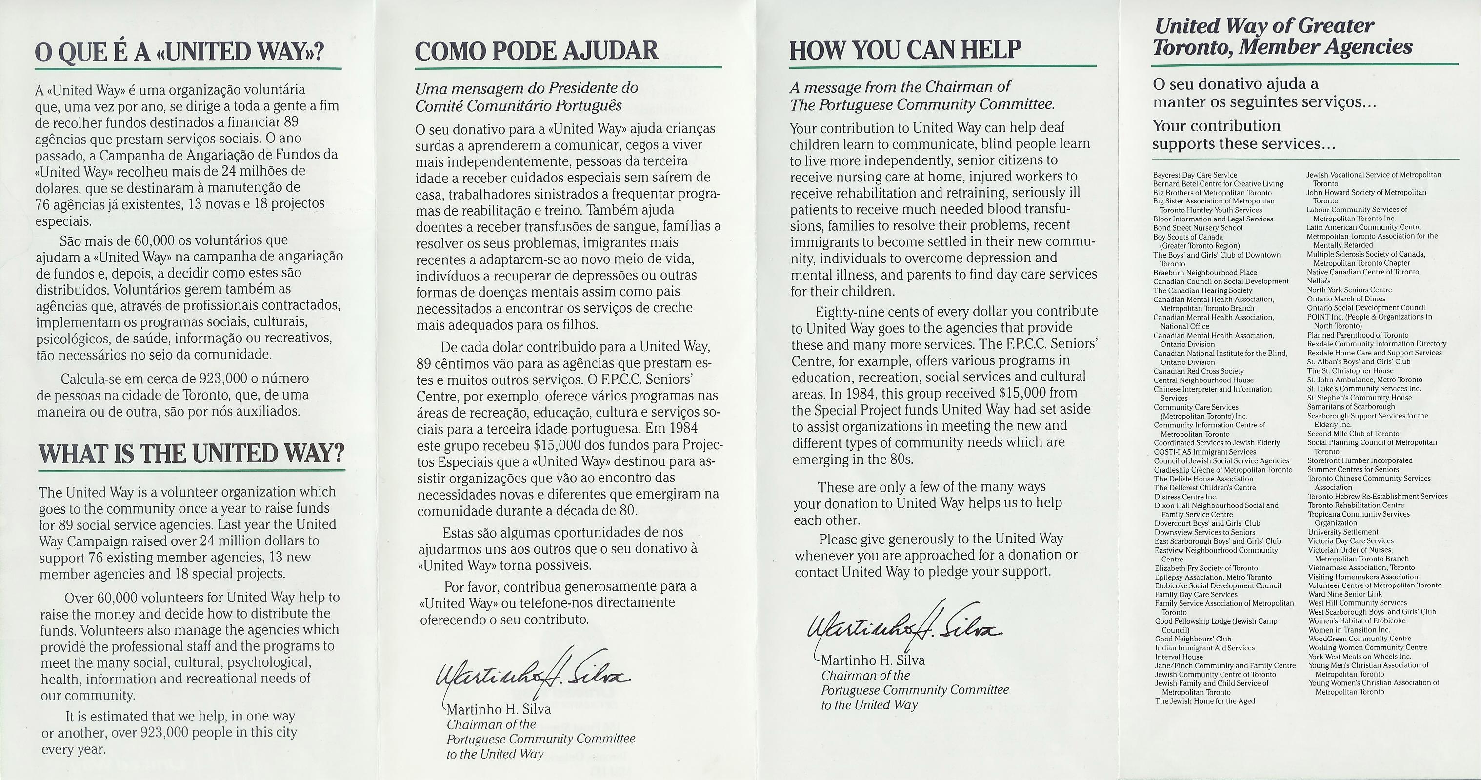 Portuguese language brochure from United Way with contact information for its Portuguese Communitarian Committee members: Virginio Brum (Portuguese Social Services), Zizina Estevens (FPCC Seniors’ Centre), João Medeiros (West End YMCA), and Martinho Silva (COSTI-IIAS). It also features photos of media personalities: Frank Alvarez (Global TV), José Eduardo (CPWA Radio), Fernando Gomes (Novo Mundo), Fernando Raposo (MTV), António Ribeiro (Correio Português), and Martinho Silva (CHIN Radio).