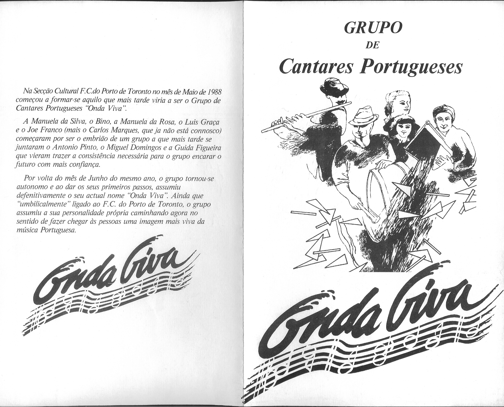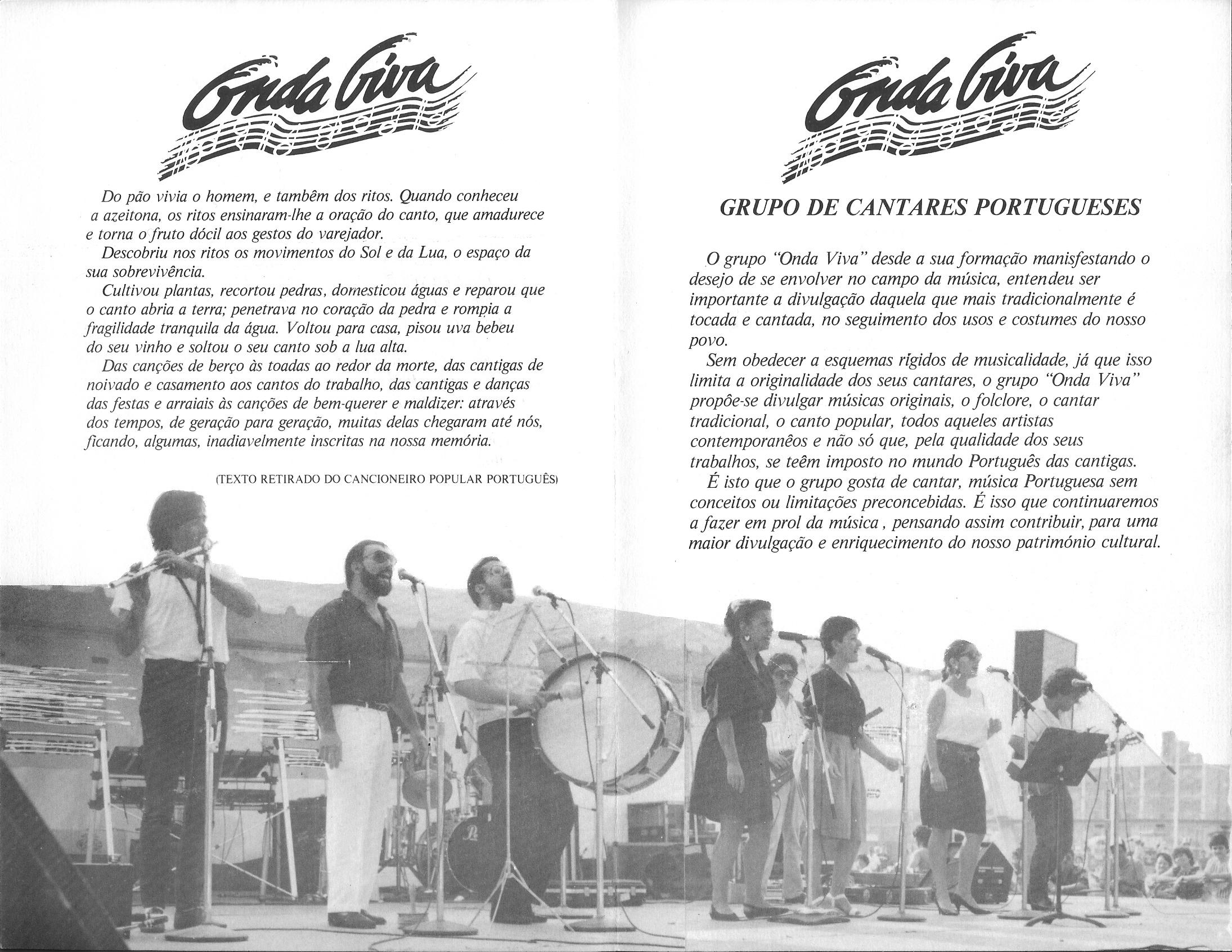 Portuguese language brochure the musical group Grupo de Cantares Portugueses Onda Viva (Portuguese Singing Group Living Wave) introducing its history, participants, and folk music identity.