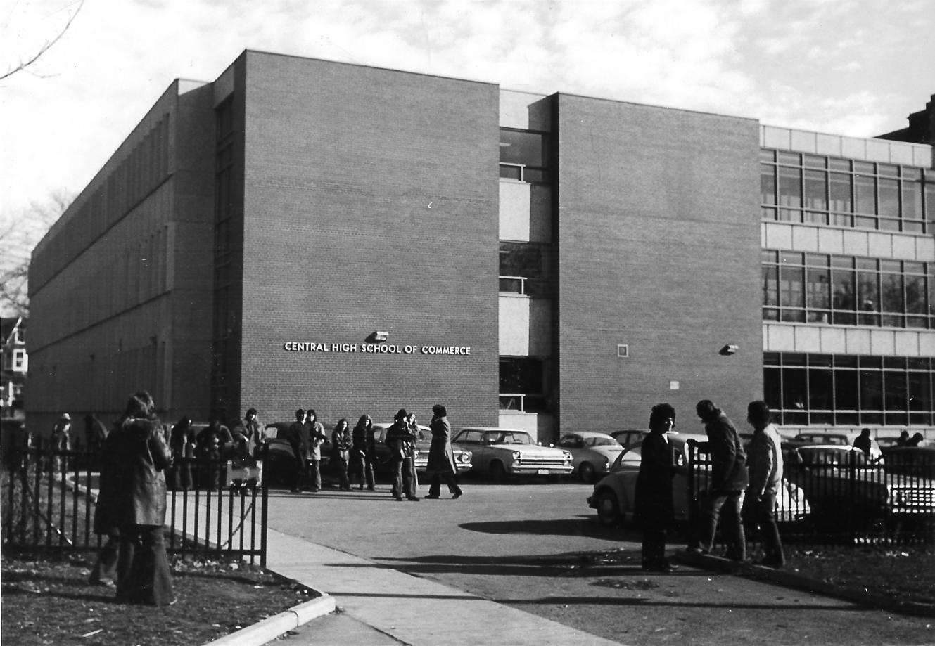 Black and white photo of the Central High School of Commerce building and parking lot with students standing outside. Published in the Comunidade newspaper issue of December 18, 1978. Domingos Marques.